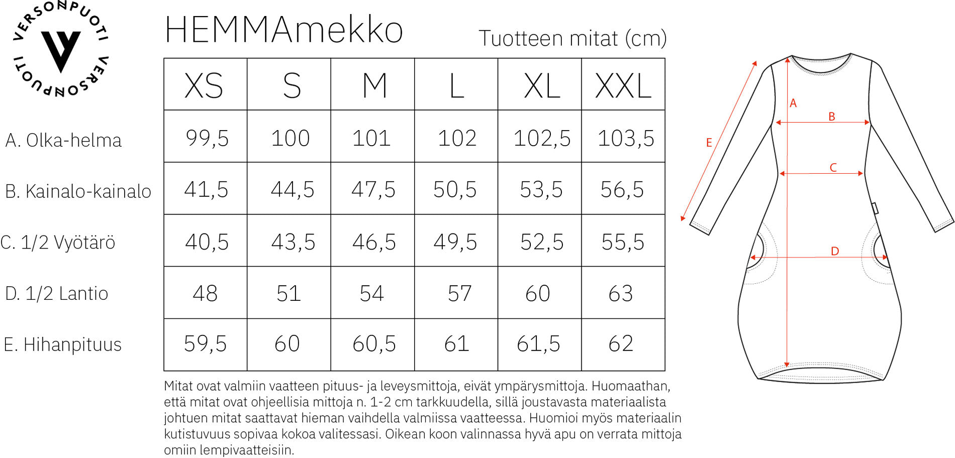 Versonpuodin monikäyttöinen pitkähihainen mekko. Hemma-mekossa on pyöreä pääntie ja sivuilla kivat taskut. Yläosa on istuva. Helmassa on rento kuminauha, joka tekee alaosasta hauskasti pussimaisen. Käytä mekkona sukkahousujen kanssa, tai yhdistele legginsien tai kapeiden pillifarkkujen kanssa. Valitse päivän menojen mukaan kengiksi tennarit tai korkkarit.