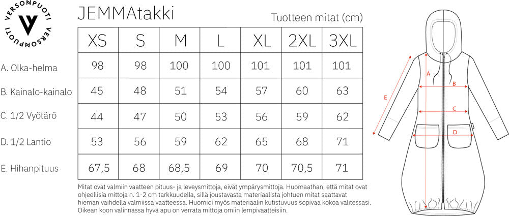 Versonpuodin hupullinen ja yksivärinen JEMMAtakki rennolla pussihelmalla. Edessä vetoketju ja alahelmassa kuminauha. Punaisessa pitkässä takissa on edessä taskut ja hupussa nauhakuja. Nauha on punainen. Jemmatakki on mitoitukseltaan reiluhko. Tuotekuvista löytyy mittataulukko, josta löytyvät tarkat mitat.